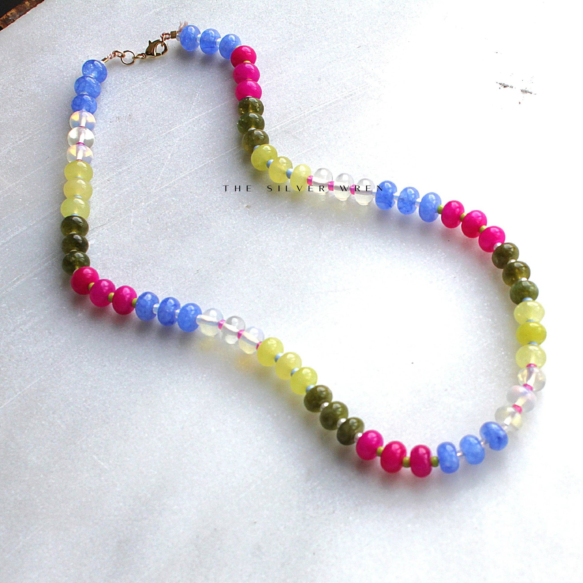 Bring color and joy to your style with our colorful beaded necklace, a vibrant blend of playful charm and handmade beauty. Carefully crafted with jade, multi-colored beads and accented with subtle seed bead spacers, this piece is perfect for expressing your fun, bold, and colorful personality.