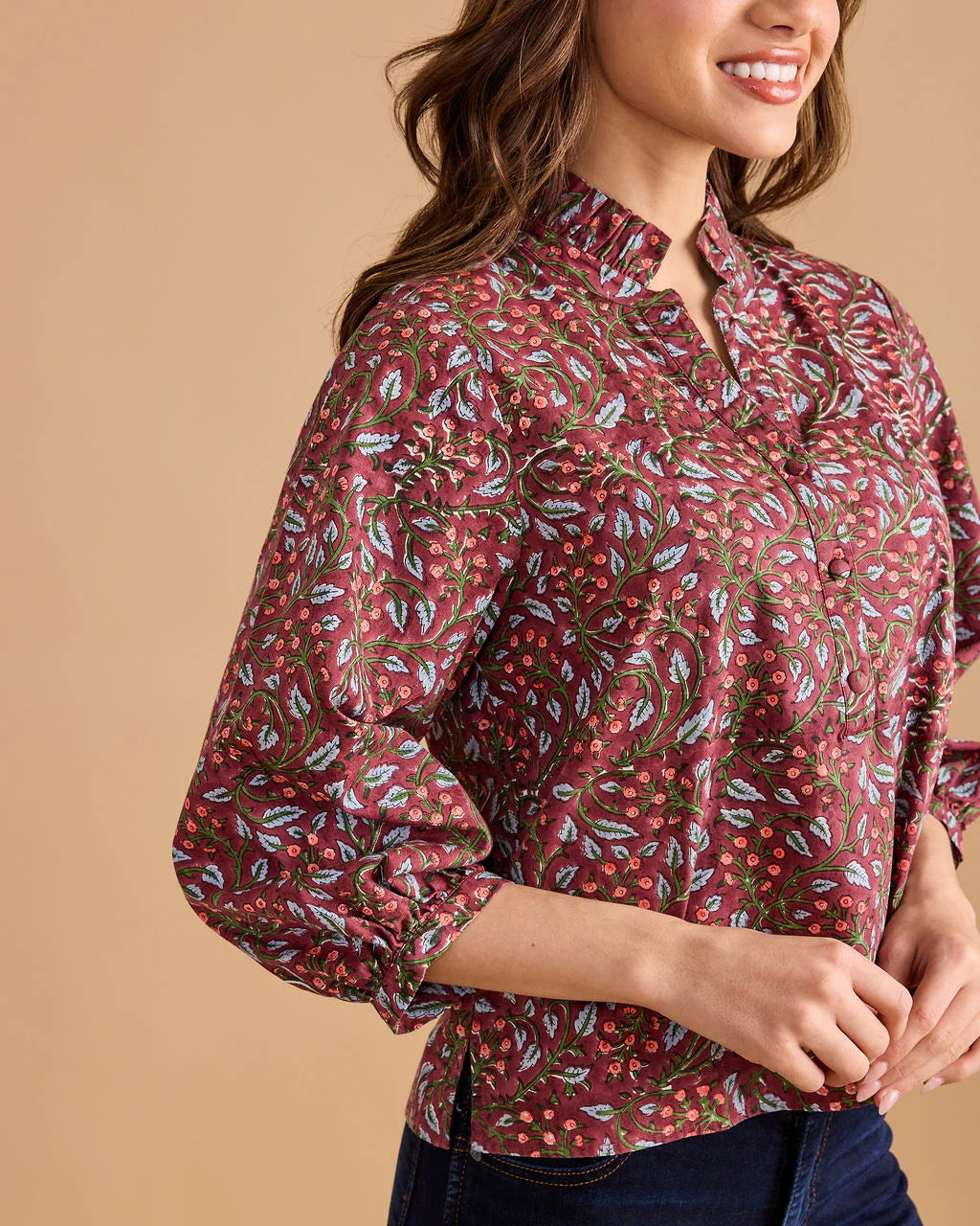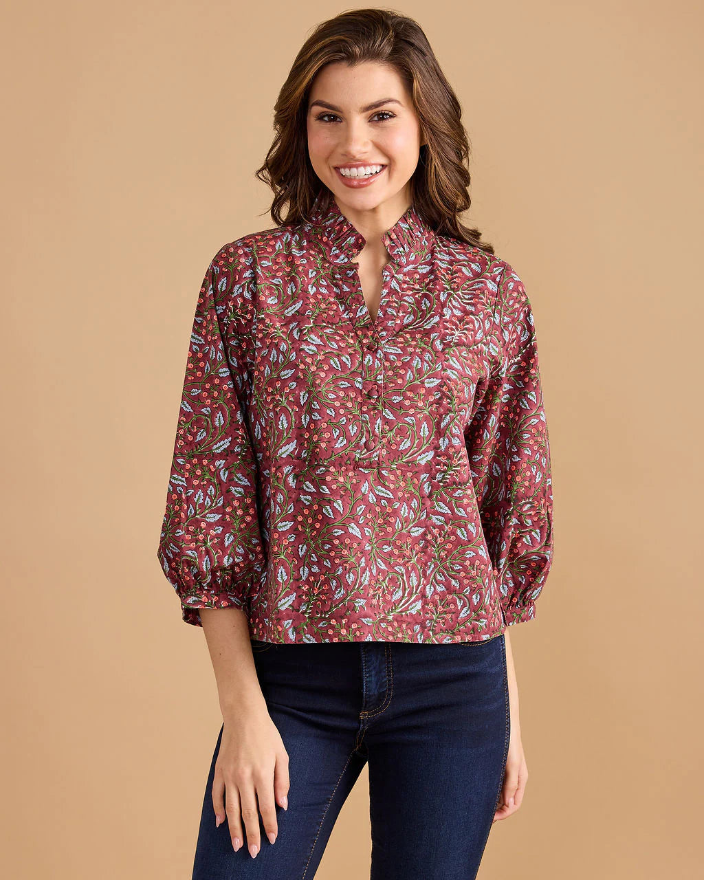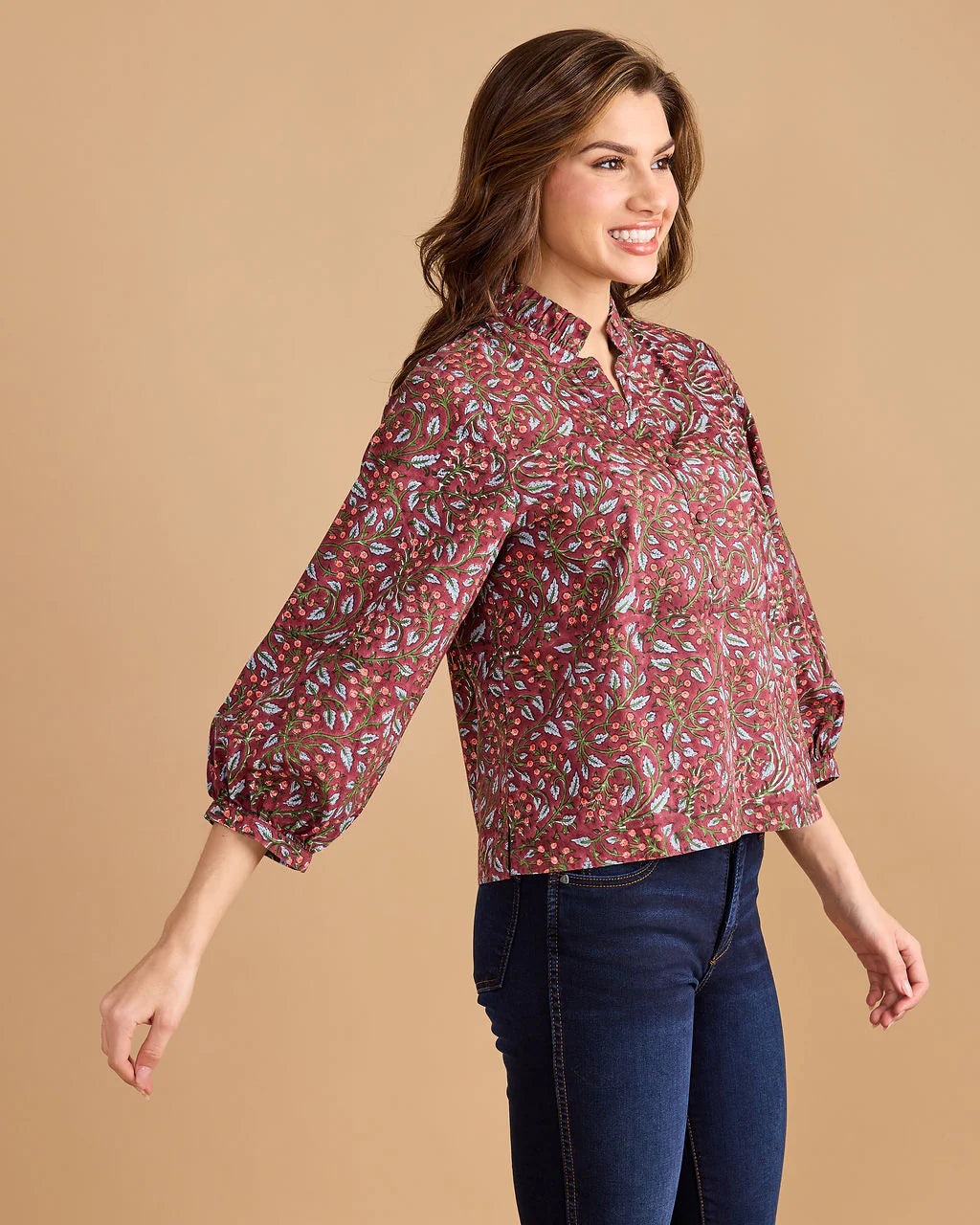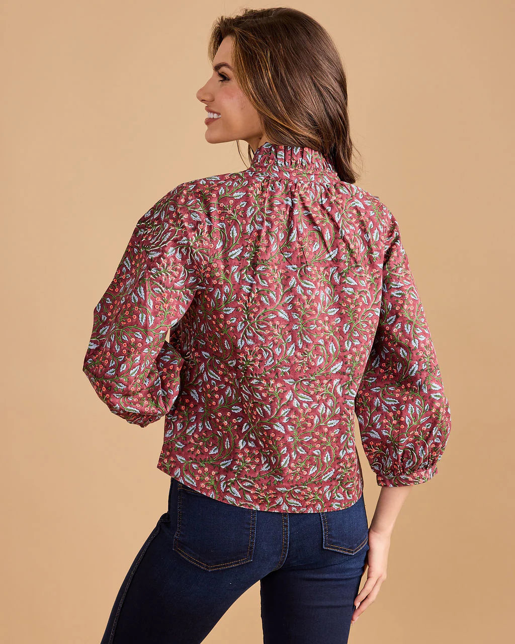 The Daniella Top in Climbing Floral features a relaxed silhouette with a split neckline and billowed sleeves for an effortlessly chic look. Its rich, nature-inspired print makes it a versatile piece for both casual days and elevated evenings.