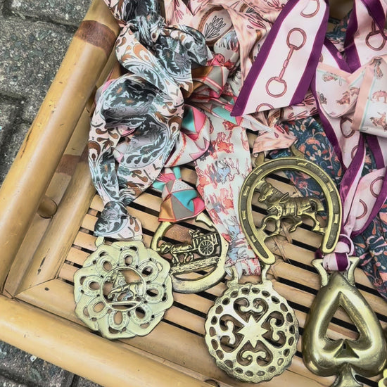 one-of-a-kind brass horse medallion necklaces on silk scarves.
