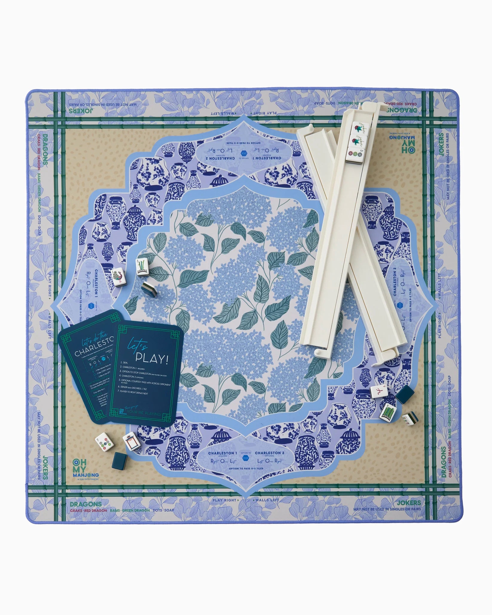 Introducing the Luna Mat — a serene yet statement-making addition to your Mahjong setup, designed for those who love timeless elegance with an artful twist. Awash in calming shades of blue and green, this mat beautifully blends hydrangea blooms, classic ginger jars, and a subtle antelope print for a look that’s equal parts coastal chic and heritage inspired. It’s sophisticated, layered, and quietly luxurious — the kind of pattern that feels right at home in your garden room, beach house, or candlelit game night setting.