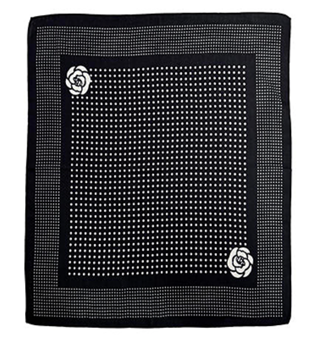 This elegant black scarf combines two timeless patterns in one captivating design—delicate rosettes paired with classic polka dots create a refined aesthetic. Cut to a perfect 25.5" x 25.5" square, it's an ideal size for versatile styling around the neck, as a head wrap, draped over your shoulders, or accessorize your handbag. The sophisticated print and luxurious proportions make this scarf a polished addition to any ensemble, effortlessly elevating both casual and formal looks.
